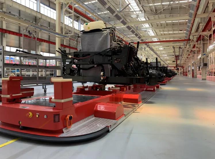 客户为国内某著名工程机械厂商,本项目由CSG华晓为其量身定制的91台AGV, 主线配备43台大型定制装配AGV,单台承重超过10T,可实现1m/min~30m/min无级变速。相比传统的拖链装配线来说,AGV装配线具有路线可调整,工位可扩展,投资更灵活的优势。除了主线的提升以外,物流自动化同步改善,37台SPS的潜伏牵引AGV自动匹配主线运行状态,按单台份定量配货,解放线边库存空间的同时又提升了装配的准确率。另外,5台平衡悬架、前中后桥分装顶升背负AGV,7台发动机分装后牵引AGV,24台驾驶室分装潜伏式牵引AGV,统筹协作实现全厂区内物流转运的无人化。