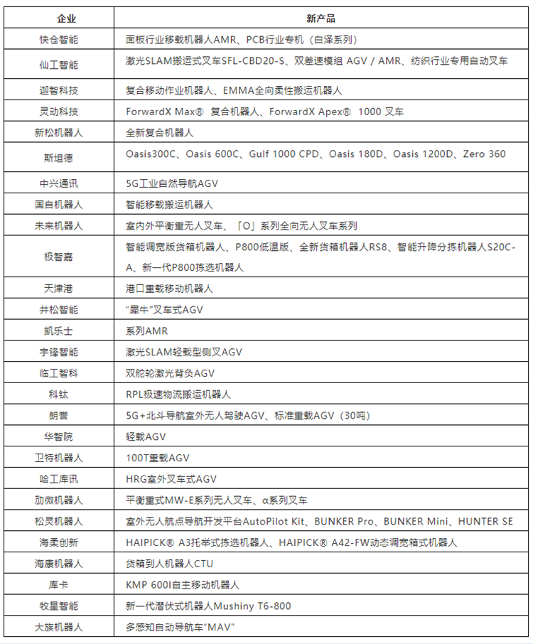根据新战略移动机器人产业研究所不完全统计,2021年,行业先后有27家企业推出了47款新产品,包括叉车、自然导航AGV、重载AGV、移动底盘以及各类行业专机等。