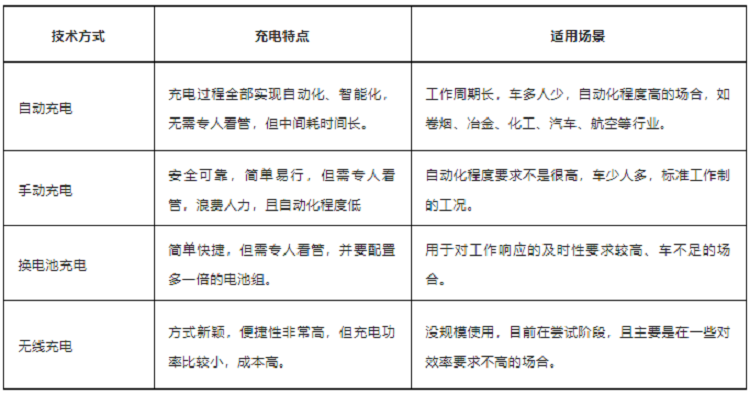 如图所示,上述四种充电方式中以自动充电的方式最为成熟和高效,因此,自动充电也成为绝大部分移动机器人厂商使用的方案。不过,美中不足的是,自动充电方式耗时较长,机器人在电量不足的情况下,需要离开产线工位到达充电站进行自我充电操作,时间在一到两个小时不等。另外,在机器人数量较多的情况下, 生产车间还需配置足够多的充电桩,这对工厂空间利用率而言也是一种浪费。