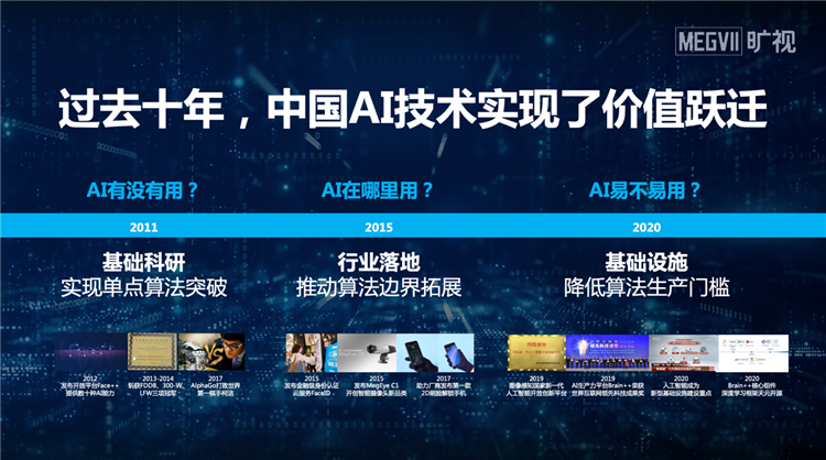 过去十年,中国AI技术发展经历了三个阶段的价值跃迁:一、基础科研,实现单点算法突破;二、落地应用,推动算法边界拓展;三、基础设施,降低算法生产门槛,以解决各行各业的问题。作为一家与中国AI行业共同成长起来的企业,旷视参与了每个阶段。