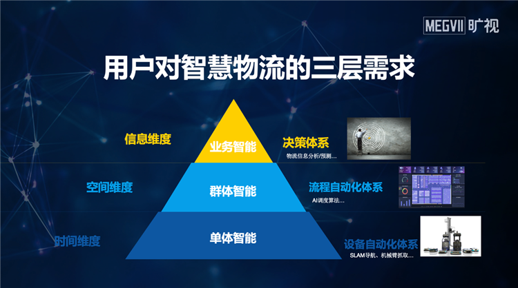 技术、市场、社会、国家政策等多要素的共同作用下,数智化升级成为企业实现降本增效的必然选择。在旷视看来,当前用户对智慧物流有三层需求: