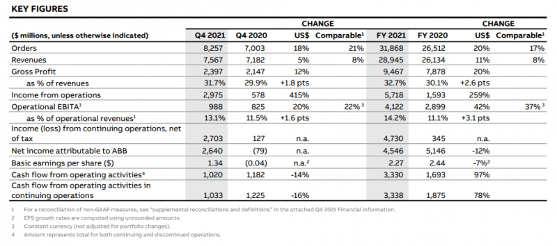 近期,ABB发布了2021年第四季度及全年业绩,具体情况如下: