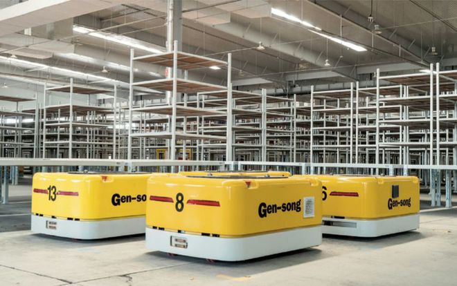 合肥井松为上汽通用东岳打造的仓储项目,整个仓库共有货架956个,每个货架5层,可以存放料箱34416个,货物种类与吞吐流量极为庞大。井松为仓库布置了21台视觉纹理导航机器人来实现整个仓库的自动化搬运,通过中央调度系统进行智能分析,合理调配每一台机器人完成各种物料的进出。
