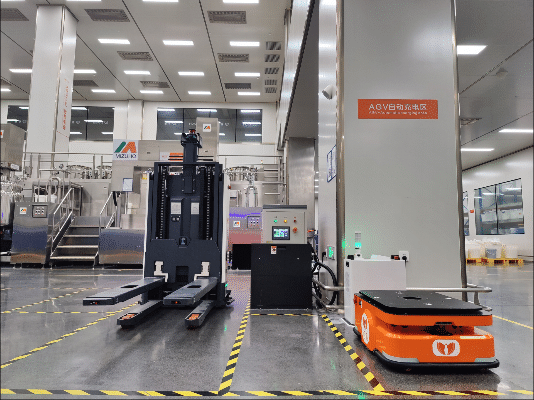 同时,由Gulf-1400-CDD无人叉车机器人负责原材料从原料仓到乳化车间的搬运、空桶的产线返回、半成品从产线到车间的中转、包材的产线搬运,搭配FMS调度管理系统,实现最优任务分配方案,让仓储物流整体效能最大化。