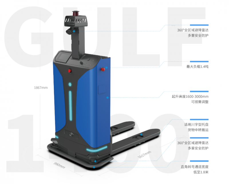 Gulf-1400-CDD无人叉车采用斯坦德自研激光SLAM导航技术,无需固定基础设施改造即可完成部署运行,同时通过托盘到位检测传感器、货叉防撞传感器、3D视觉相机、RFID等多传感器融合技术,实现智能高效安全取放料作业。