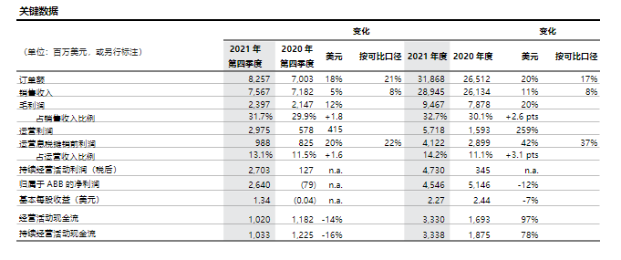 ABB集团首席执行官罗必昂表示:“2021是表现出色的一年,市场需求强劲,盈利能力提高,业务组合进一步巩固,同时现金流保持充沛,我们对2022年满怀信心。”