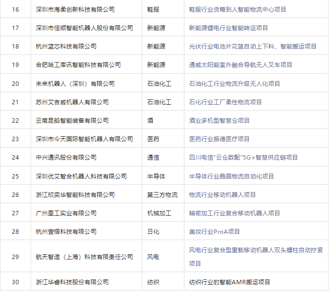 该合集甄选了30家企业30个经典案例,涵盖了汽车汽配、工程机械、第三方物流、3C电子、医药医疗等众多行业,无论是产品的创新度还是技术实力都有较高的代表性,是中国工业应用移动机器人经典之作,具体入选案例名录如下: