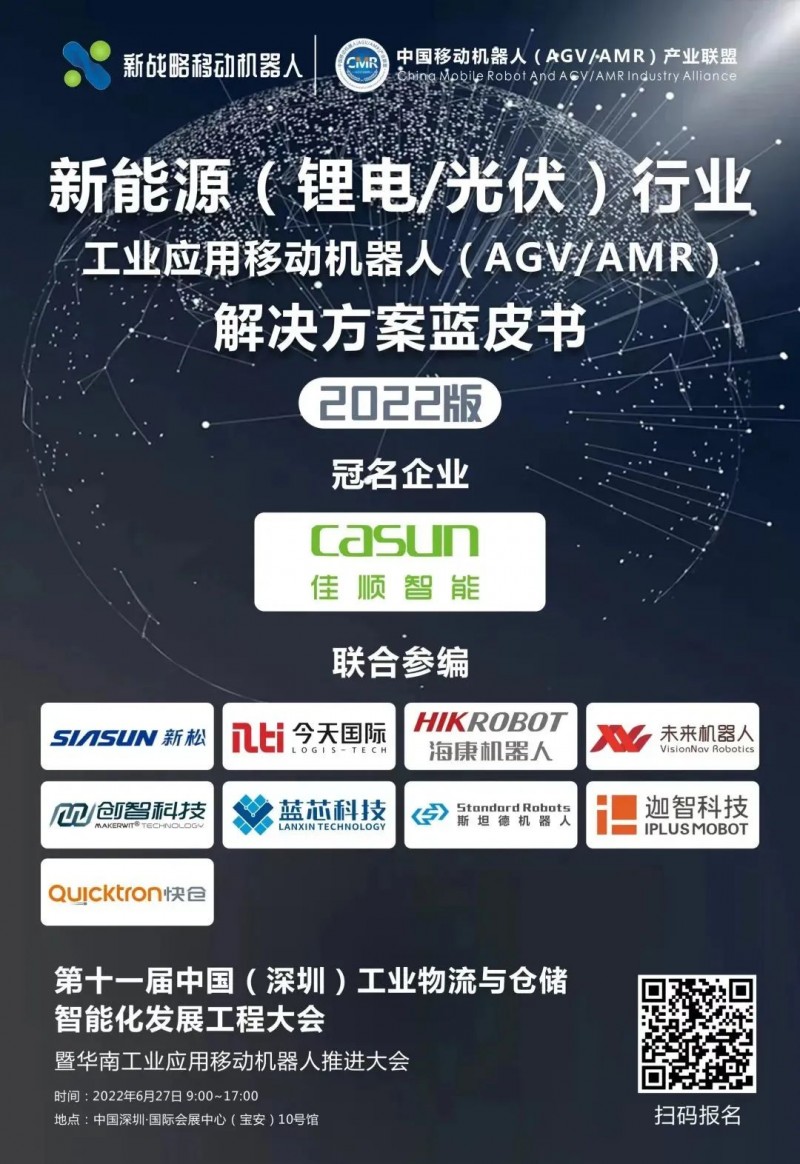 为了更好地解读新能源行业移动机器人应用现状及趋势,6月27日,由中国移动机器人(AGV/AMR)产业尊龙凯时、新战略移动机器人产业研究所主编的《新能源行业用移动机器人(AGV/AMR)解决方案蓝皮书(2022版)》将在“中国(深圳)工业物流与仓储智能化发展工程大会暨华南工业应用移动机器人推进大会”上正式发布!