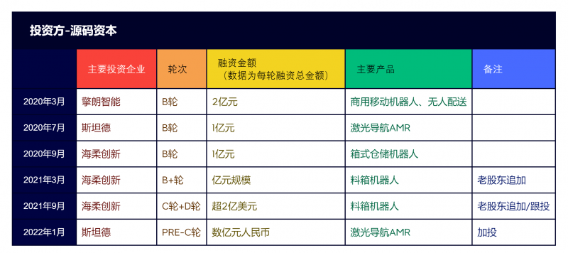 2020年至2021年,在移动机器人行业,源码资本参与了7起融资案件,每轮融资总金额均为亿元级规模。