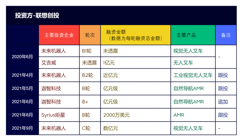 2020年至2021年,联想创投在移动机器人行业参与了7起融资事件,被投企业包括未来机器人、艾吉威、迦智科技、Syrius炬星。