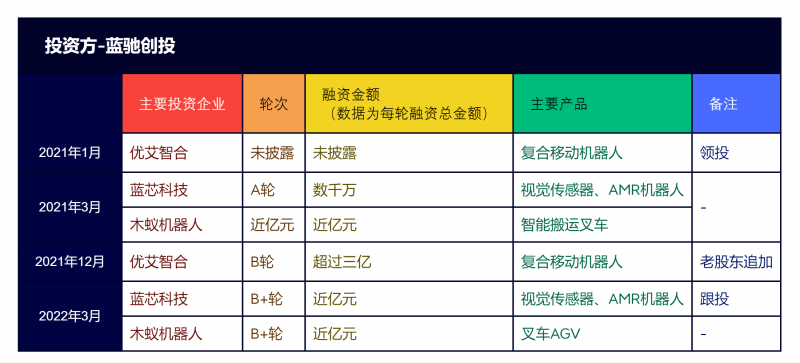 蓝驰创投从2014年开始关注机器人赛道,近年来,蓝驰创投在工业移动机器人行业内投资企业包括优艾智合、蓝芯科技、木蚁机器人。