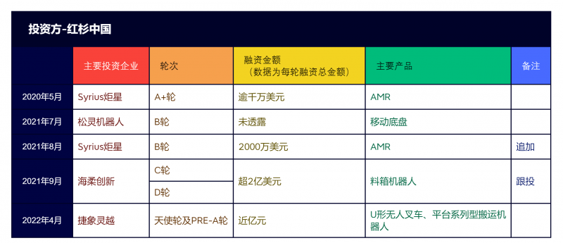 2020年以来,红杉中国在工业应用移动机器人行业中共参与了6起融资事件,被投企业主要产品覆盖了移动机器人的移动底盘、无人叉车以及AMR等,企业专注市场领域从海内囊括到海外,包括上文提及的“海归”Syrius炬星、专注于“箱式仓储机器人”的海柔创新,以及“移动底盘专家”松灵机器人和“打破传统叉车固化设计”捷象灵越。