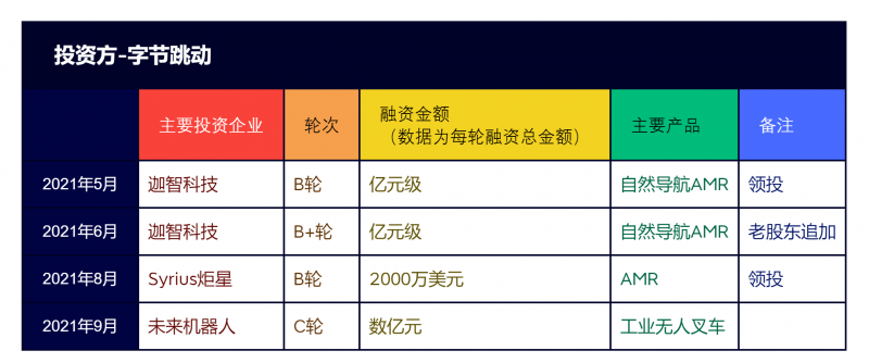在移动机器人行业内,字节跳动去年一年参投了迦智科技、Syrius炬星和未来机器人3家企业。