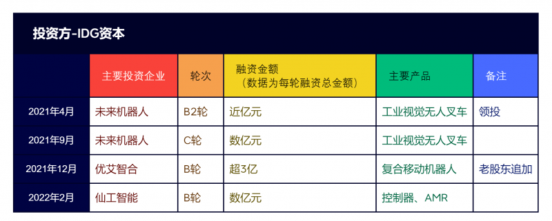 2021年4月至2022年2月期间,IDG资本在移动机器人领域投资了未来机器人、优艾智合和仙工智能三家移动机器人企业。