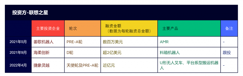 近两年,联想之星在工业移动机器人领域投资了三家企业,包括箱式仓储机器人科技企业海柔创新、机器人通用底盘松灵机器人、AMR机器人公司姜歌机器人,基本上都是从天使轮开始切入。