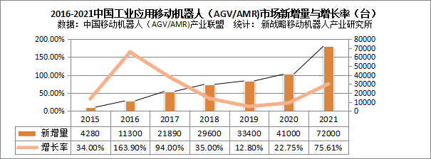 图表:2015-2021中国市场企业工业应用移动机器人(AGV/AMR)新增量(台)与增长率