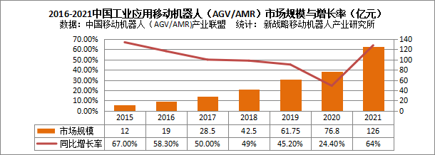 图表:2015-2021中国工业应用移动机器人(AGV/AMR)市场规模(亿元)与增长率